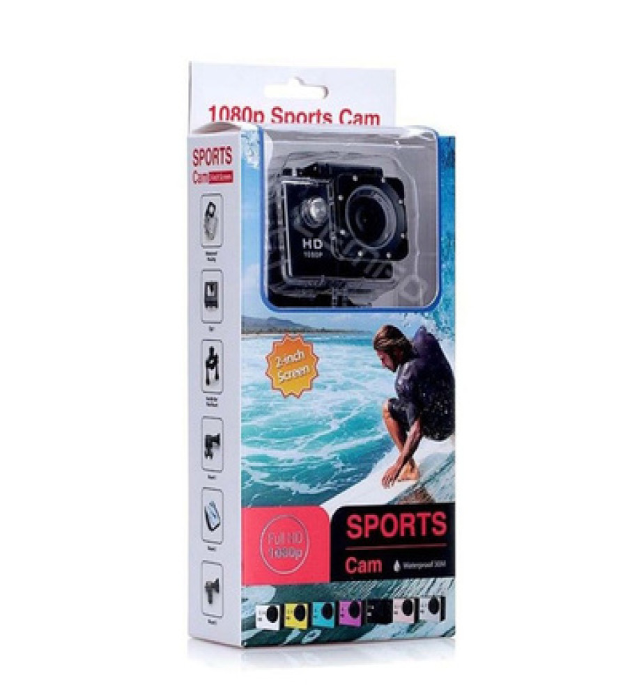 90 degree wide-angle lens.With waterproof case for takingwonderful video underwater up to 30 meters.• 2.0" screen with 1080P HD high quality resolution. • 90 degree wide-angle lens. • With waterproof case for taking wonderful video underwater up to 30 meters. • Support burst, time lapse and continuous shooting• Support EV compensation, shutter control and PC camera.• Support Micro SD Card up to 32G. (Not included). • Mini size, light weight, easy to carry. • Comes with many accessories, such as bicycle stand, base mount, bandage and so on. 'Camera can be mounted on helmet, bike, car windshield, and other similar objects, suitable for outdoor sport like riding, skiing, climbing, etc.• Specifications: Display (LCD): 2.0 Inch 'Lens: 90 degree wide-angle lens • Color: Black• Language: English, French, Italian, Russian, Spanish, Traditional Chinese Korean, Japanese, Portuguese, German, Simplified Chinese, Dutch, Hungarian, Polish.• Resolution: 1280 * 720 / 30FPS • Video Format: AVIVideo • Recording Mode: Loop recording• Resolution of Photos: 5M/3M/2M/1MStorage: TF Card, up to 32 GB(not included) • Shooting Mode: Single Shot / Self-timer '/ Continuous Shooting• Self-timer: (2s / 3s / 5s / 10s / 20s / 30s / 60s) • USB Interface: USB2.0 • Battery Capacity: 900MAH • Operating System (OS): Windows98/me/XP/vista/7 MacOS/