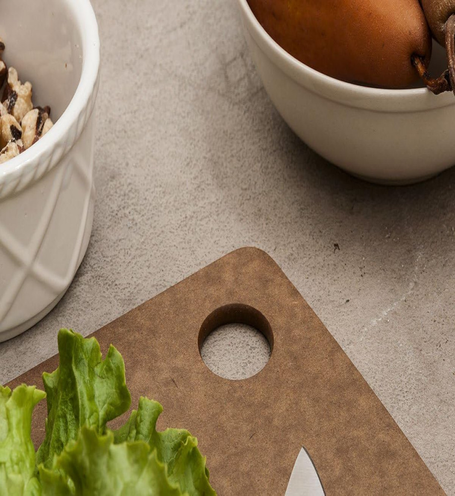 17.5-Inch x 13-inch cutting board in nutmeg; made in the USA from Richlite paper composite material; makes the cutting board durable, knife friendly, non-porous